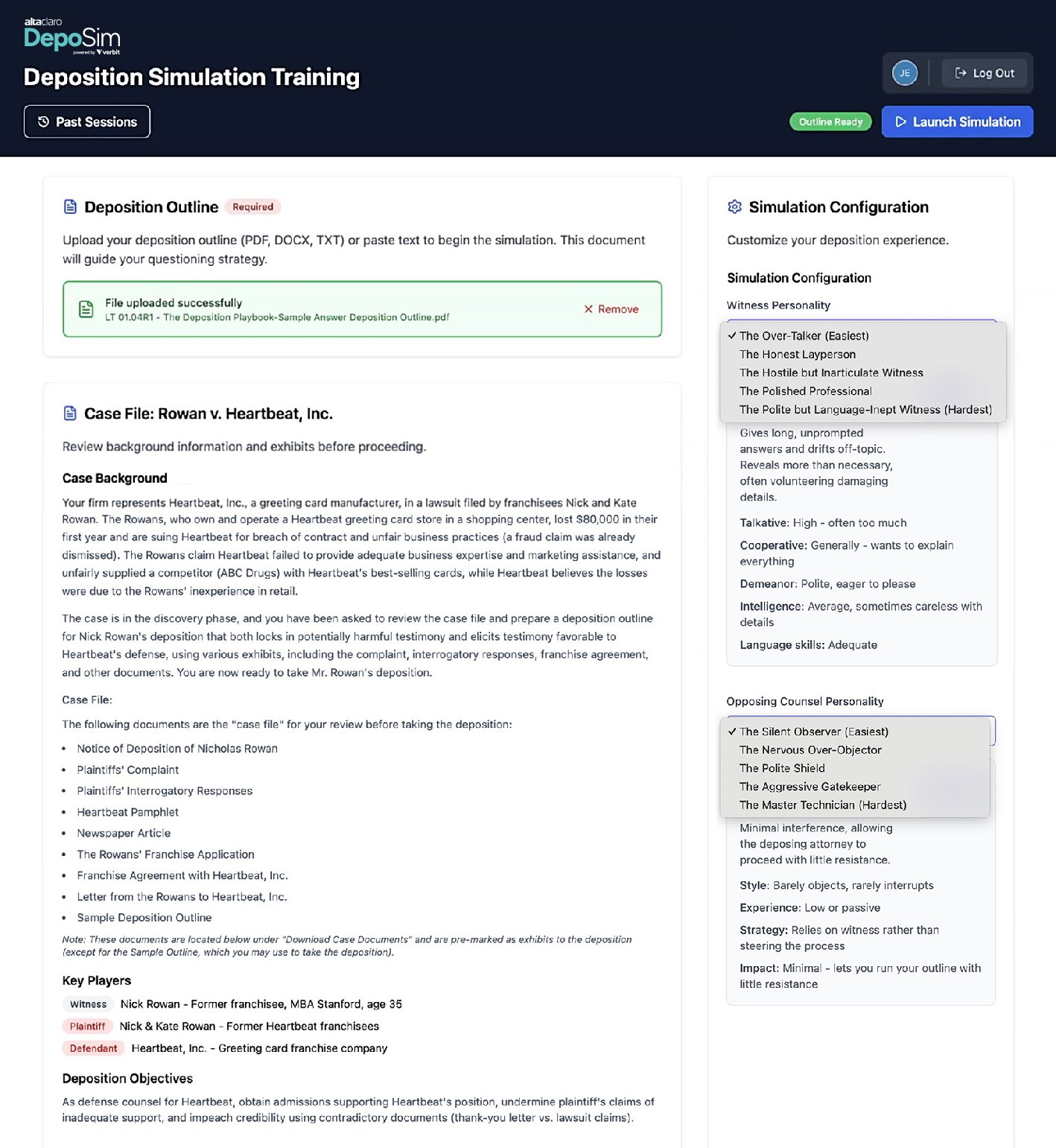 Run the simulation as many times as you want to focus on the specific parts of a deposition you’re working to improve. Use targeted repetition across different personalities and scenarios to refine questioning, pacing, exhibit flow, and objection handling.