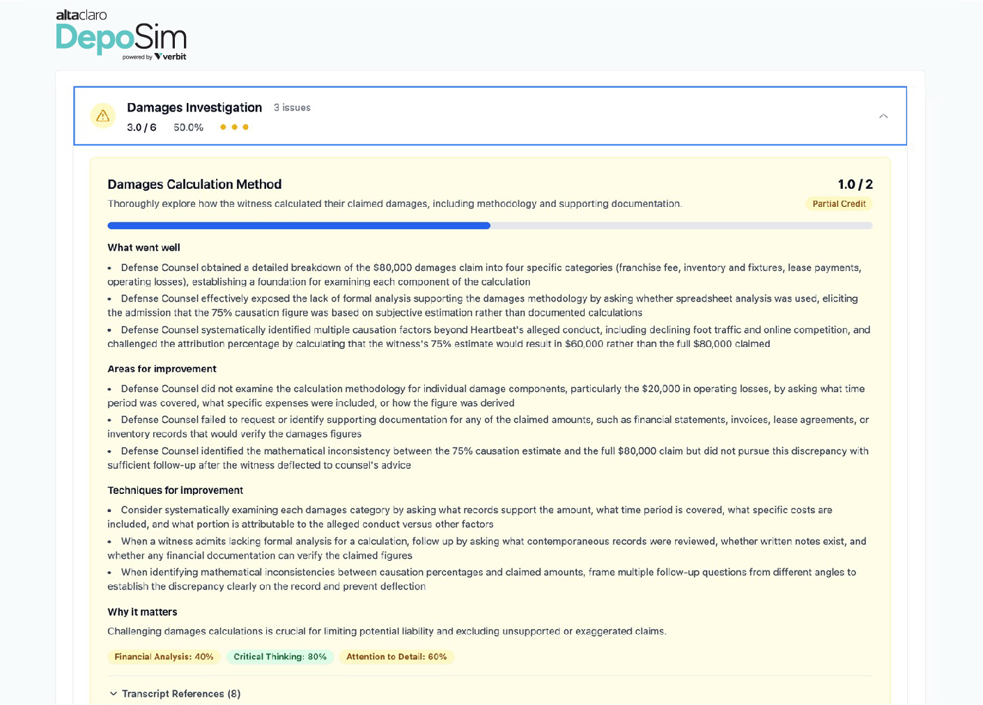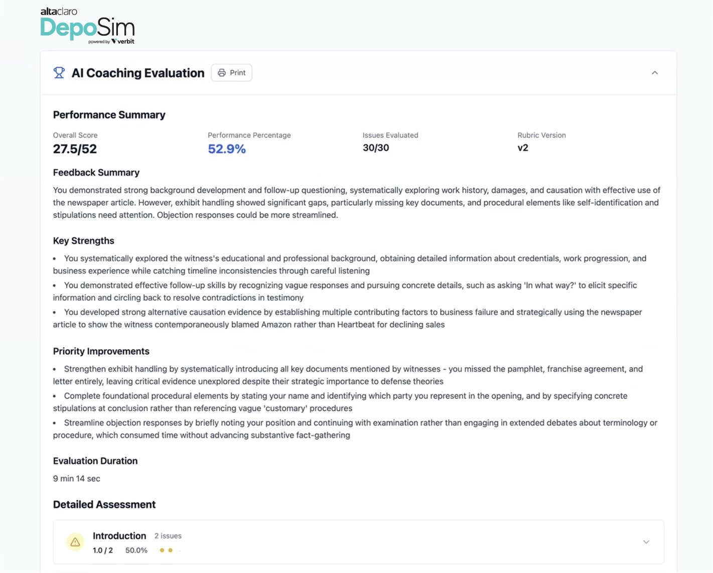 Unlike general-purpose AI, DepoSim’s feedback is structured by AltaClaro’s proprietary pedagogy. The system evaluates performance against a rigorous training rubric that tracks a number of objective metrics including exhibit handling techniques, use of exhibits, follow-up questions, question types (open vs. closed), and other substantive and stylistic factors.